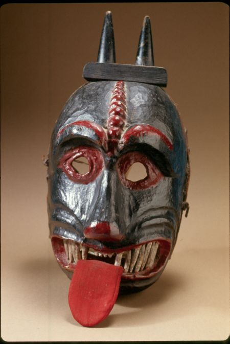 Die schwarze Teufelsmaske aus Holz mit Hörnern und rotem Kamm, roter Augenumrandung, Furcht einflössenden Zähnen und breiter roter Stoffzunge („Lälle“) zählt zu den traditionellen hölzernen Fasnachtsmasken der Schweiz.